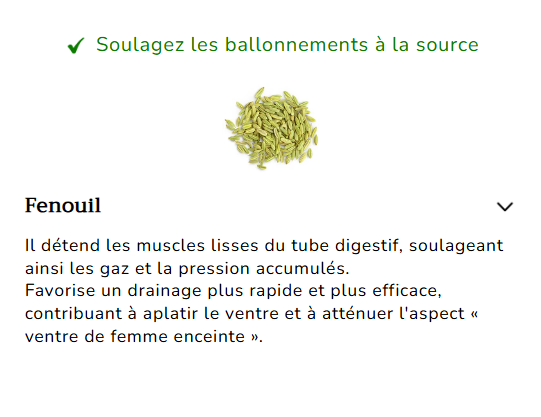 Le fenouil – détend les muscles digestifs pour soulager les gaz et les ballonnements, favorisant une digestion plus fluide et plus efficace et un ventre plus plat.