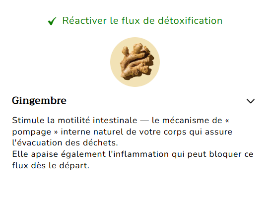 Gingembre – Stimule le flux naturel de détoxification et la motilité intestinale tout en apaisant l'inflammation qui peut ralentir la digestion.