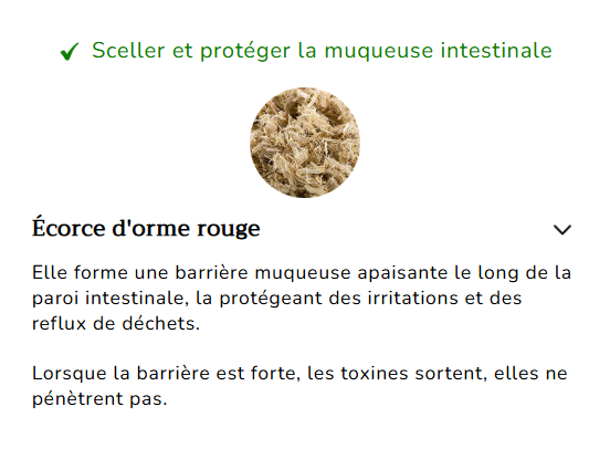 Écorce d'orme rouge – Forme une barrière apaisante le long de la paroi intestinale pour protéger contre l'irritation et le « reflux » de toxines.