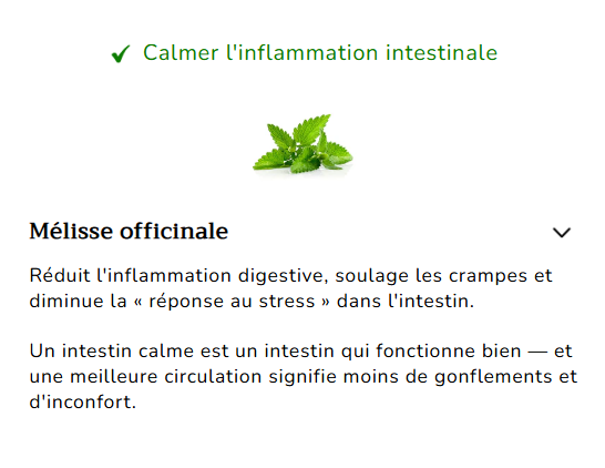 La mélisse – Calme l'inflammation digestive, soulage les crampes et favorise un transit intestinal équilibré et confortable.