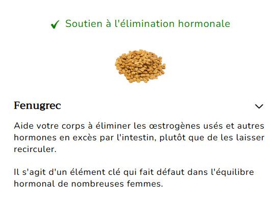 Le fenugrec aide l'organisme à éliminer les hormones usagées et les toxines en excès par l'intestin, favorisant ainsi un équilibre hormonal sain.