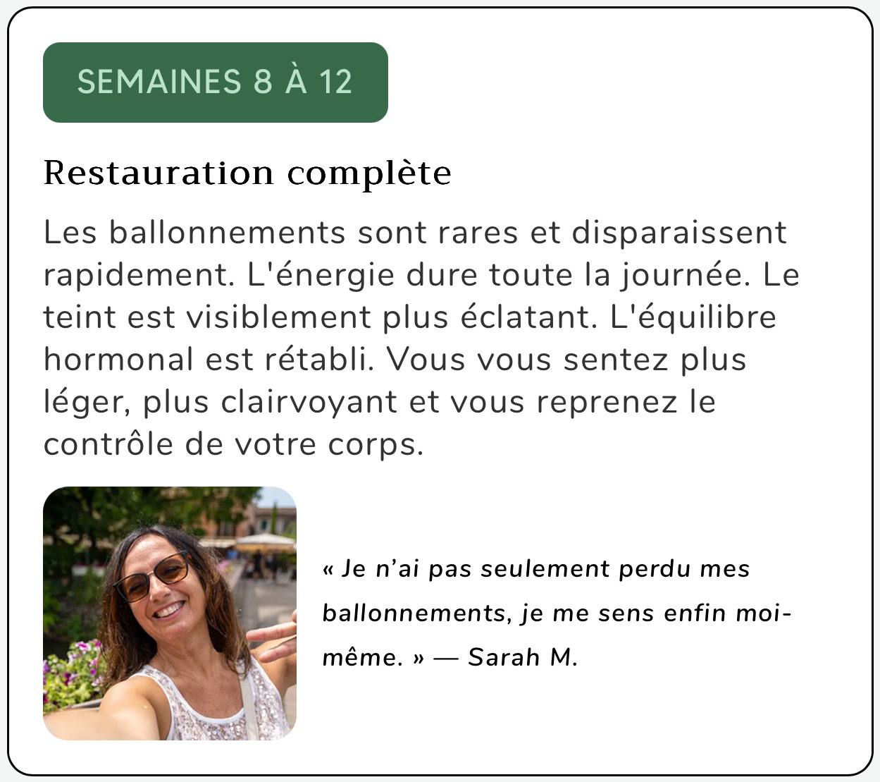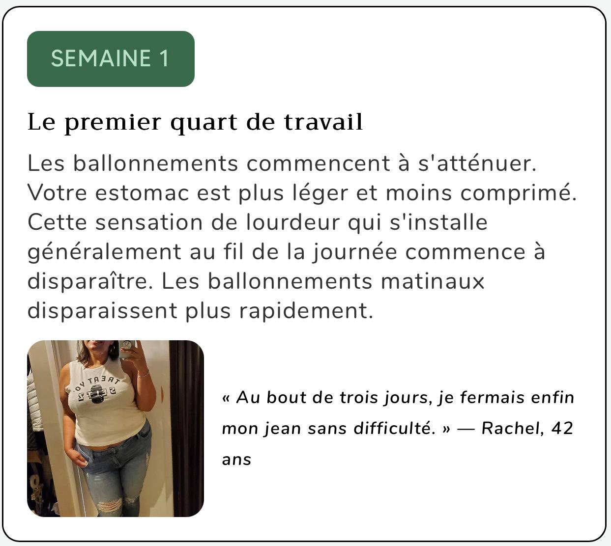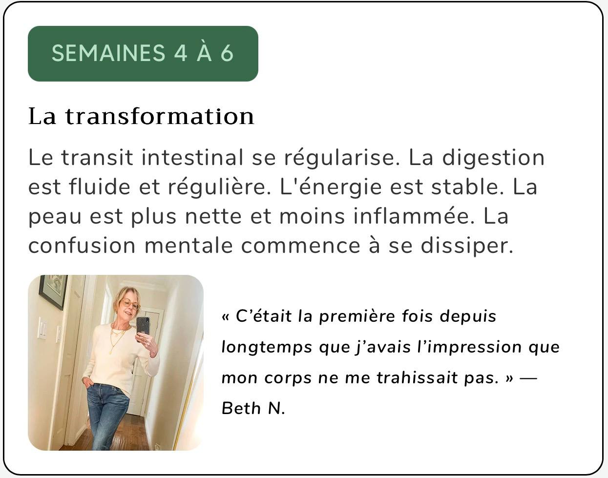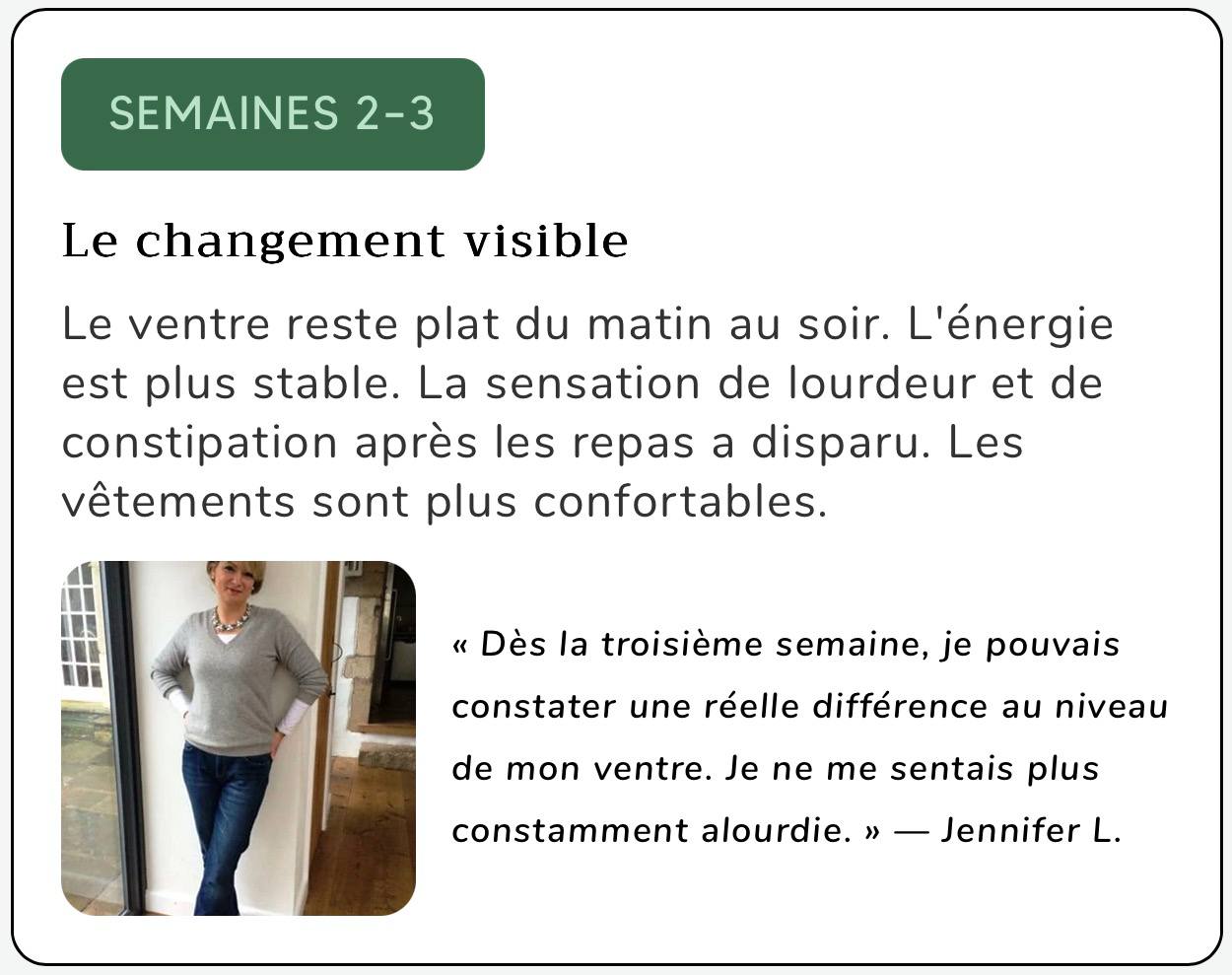 Soyons honnêtes concernant les délais. Votre transit intestinal est probablement ralenti depuis des mois, voire des années. Une véritable restauration ne se fait pas du jour au lendemain. Voici ce que des milliers de femmes rapportent une fois que leur transit intestinal reprend :